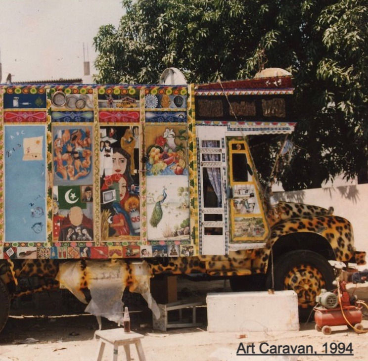 'Art caravan' was a similar truck project by David Alesworth and Durriya Kazi with the Karachi School of Art's students who collaborated in the appropriation of making 'truck' as a mobile art exhibition. It was an inspiring way to get away from the commercialized world of art and bring folk art more recognition across Pakistan by ''trans-regional dialogue''. Combining painting, sculpture and local truck art, the images of leopards, cubs, etc reflected dark hidden meanings referring to Karachi's political and social environment in the 1990s. The panels on different sides of the truck expressed the pressures faced by young individuals in difficulties of being caught in the culture of 'drugs, violence, and corruption'. It also concluded the debate of the ownership/authorship of art and gave room for self-agency. As they traveled to different cities, their work started becoming more familiar with what the newer audiences across Pakistan could relate to.[4] However, it faced the difficulty of making people understand decorative truck as art and how it differed from the normal decorative trucks they saw on the roads. This brought the debate of what constitutes art? Should art be educative? It made people compare the art made with a degree (art institution) versus self-taught art (local truck artists and cinema painters).[5] Duriya Kazi had also received an email saying, '' 'the fantasies of uneducated masses ...Image-making in itself cannot be art. For it to be art, it must have an agency. It must contain reflection and contemplation, by which it must declare itself as an art beyond its (decorative) visibility.''[6] Durriya Kazi referred to this collective exhibition as "the unwanted tapestry of our lives. Many of the images on the truck are a strong protest against this lifestyle. Primarily it is the voice of optimism, of youth, of the faith that there is no step too small to bring a better future."[7]